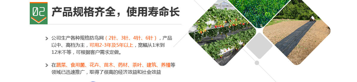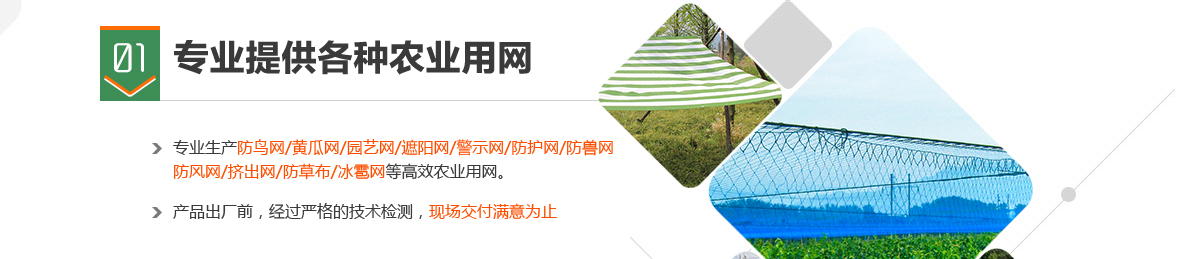我公司主要生產(chǎn)水稻育種防鳥(niǎo)網(wǎng)、葡萄防鳥(niǎo)網(wǎng)、櫻桃防鳥(niǎo)網(wǎng)、枸杞防鳥(niǎo)網(wǎng);黃瓜網(wǎng);園藝網(wǎng);遮陽(yáng)網(wǎng);警示網(wǎng);防護(hù)網(wǎng);防獸網(wǎng);防風(fēng)網(wǎng);擠出網(wǎng)等高效農(nóng)業(yè)用網(wǎng)。